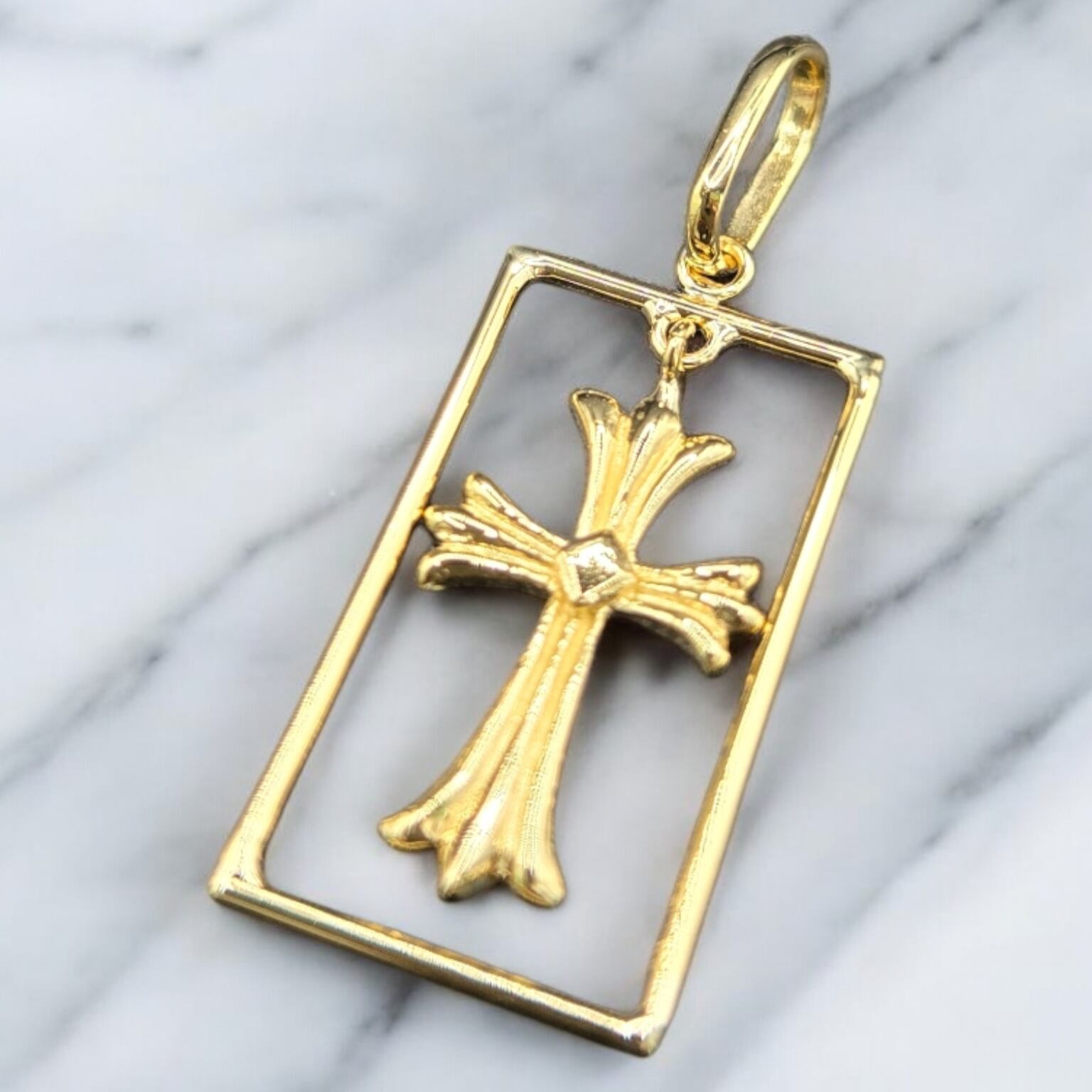 高品質なK18ゴールドを使用し、枠と十字架が固定されていないことで、動きのあるスタイルを実現しています。