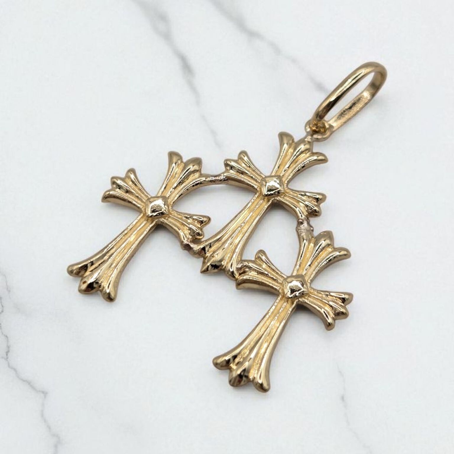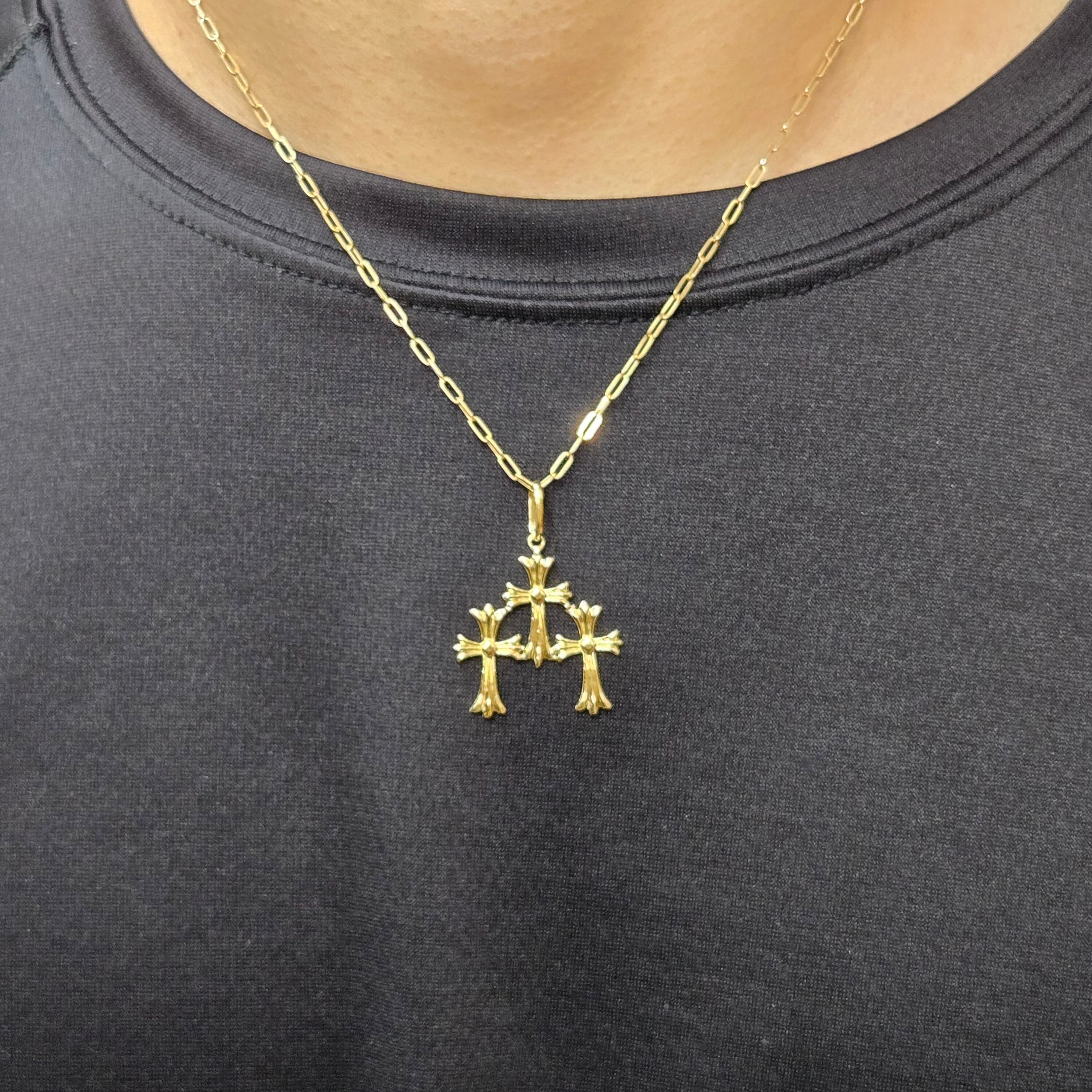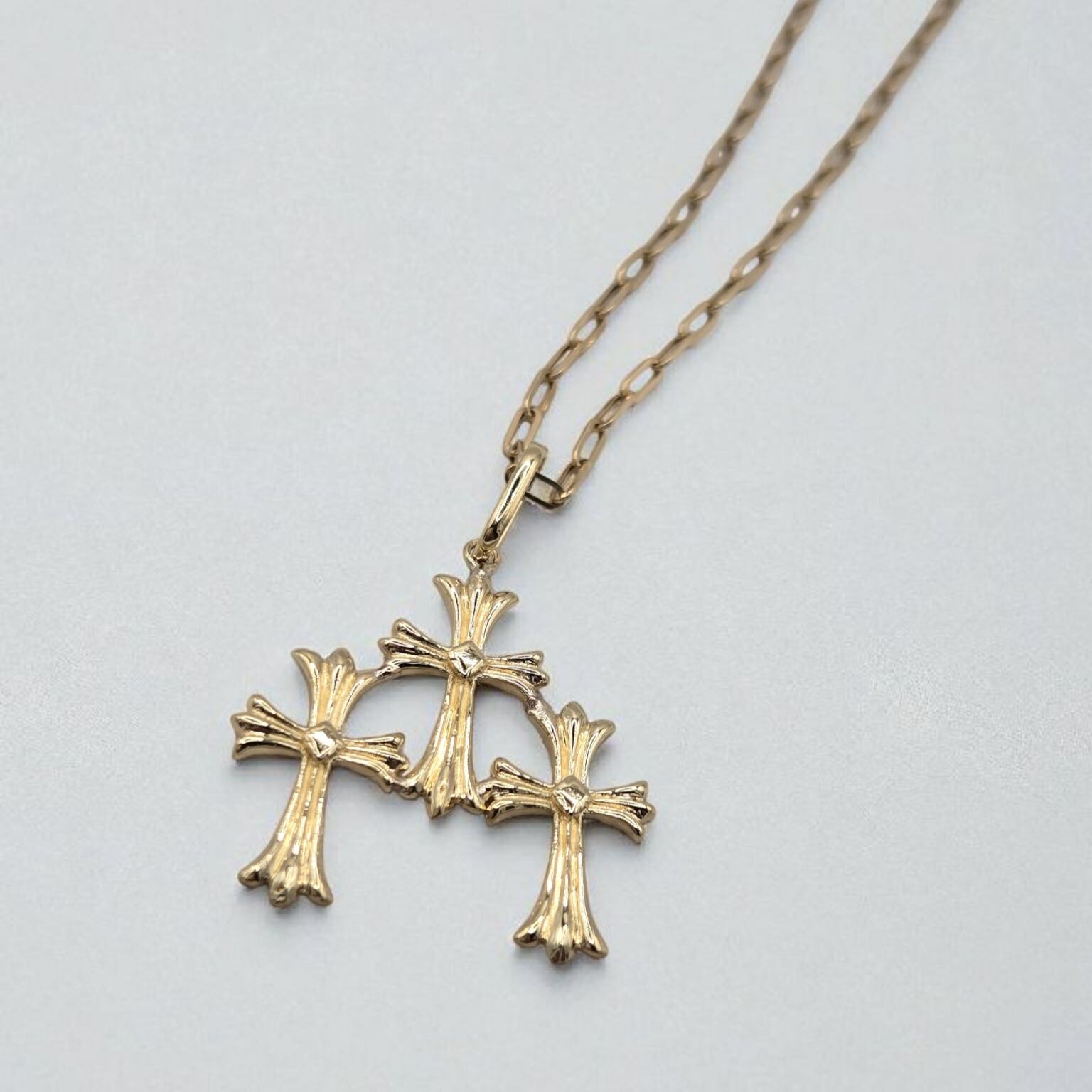 このペンダントは、個性的なデザインが魅力の3つの十字架が連なるスタイルです。